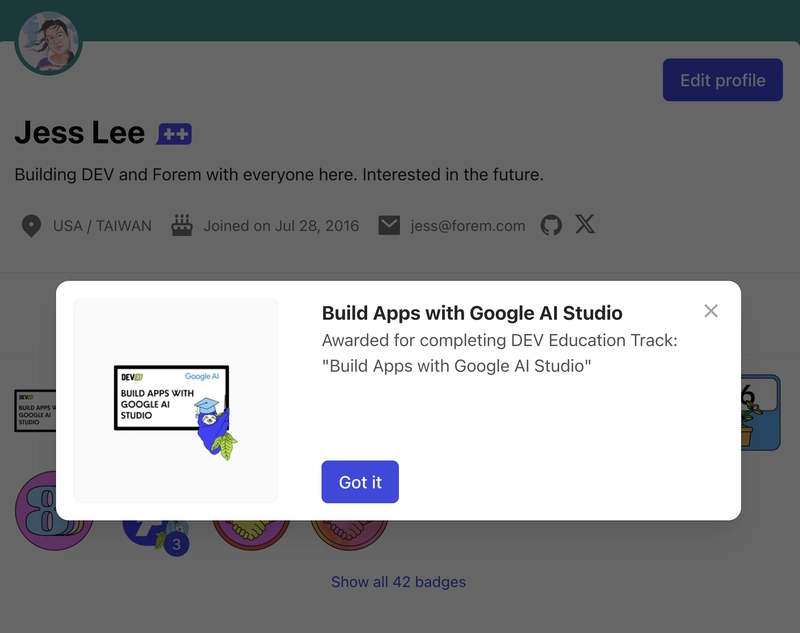 Everyone who completes the track by sharing their assignments will earn the exclusive "Build Apps with Google AI" badge on their DEV profile!